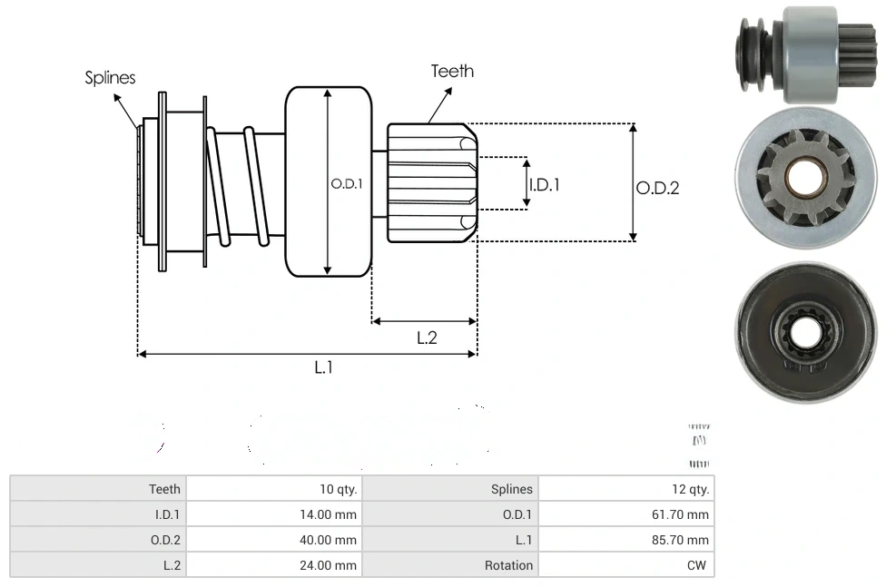 Starter drives Teeth [ qty. ] 10 Splines [ qty. ] 12 I.D.1 [ mm ] 14.00 O.D.1 [ mm ] 61.70 O.D.2 [ mm ] 40.00 L.1 [ mm ] 85.70 L.2 [ mm ] 24.00 Rotation CW