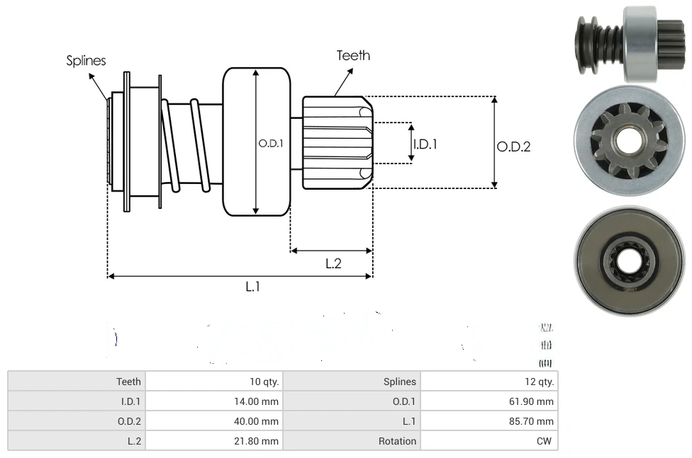 Starter drives Teeth [ qty. ] 10 Splines [ qty. ] 12 I.D.1 [ mm ] 14.00 O.D.1 [ mm ] 61.90 O.D.2 [ mm ] 40.00 L.1 [ mm ] 85.70 L.2 [ mm ] 21.80 Rotation CW
