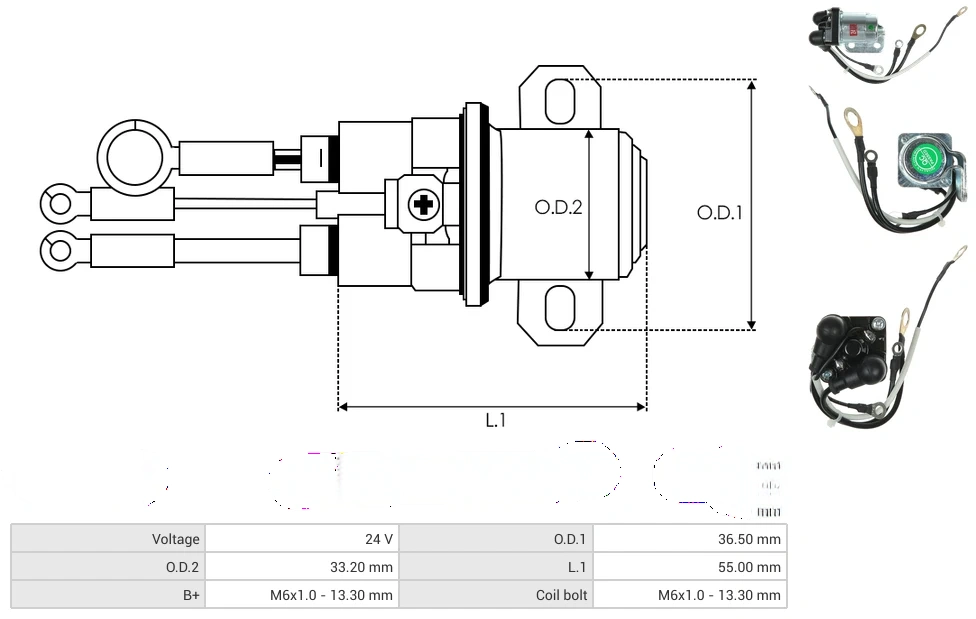 Starter safety switches Voltage [ V ] 24 O.D.1 [ mm ] 36.50 O.D.2 [ mm ] 33.20 L.1 [ mm ] 55.00 B+ [ mm ] M6x1.0 - 13.30 Coil bolt [ mm ] M6x1.0 - 13.30