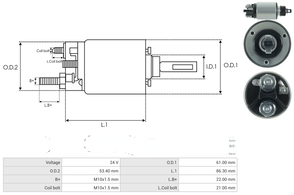 Starter solenoids Voltage [ V ] 24 O.D.1 [ mm ] 61.00 O.D.2 [ mm ] 53.40 L.1 [ mm ] 86.30 B+ [ mm ] M10x1.5 L.B+ [ mm ] 22.00 Coil bolt [ mm ] M10x1.5 L.Coil bolt [ mm ] 21.00