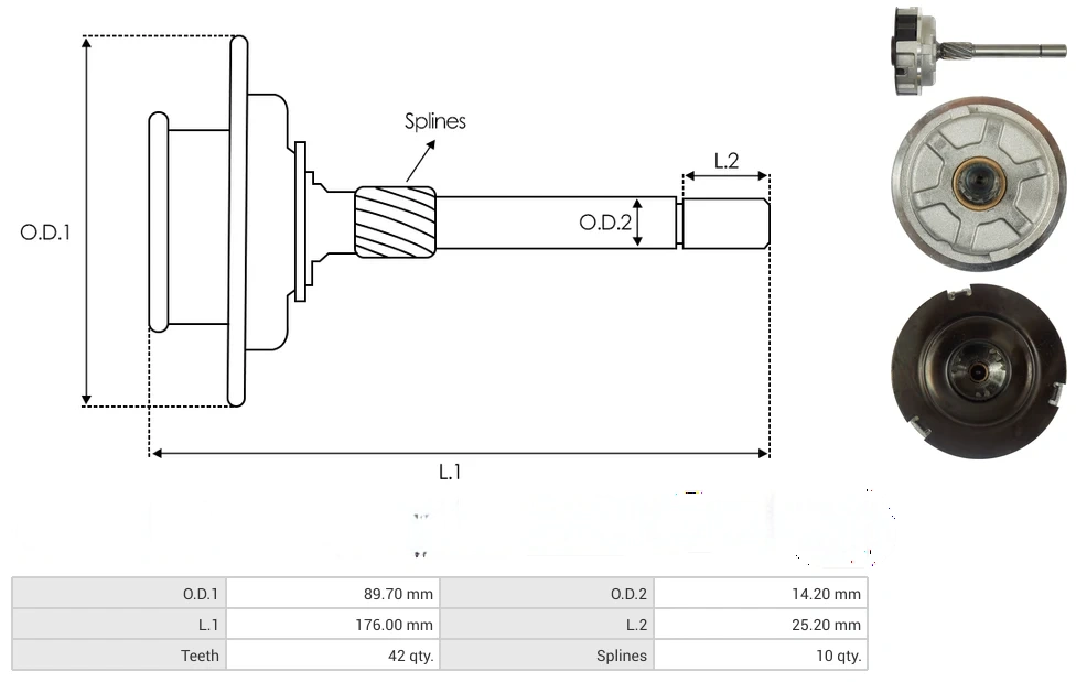 Starter planet gears O.D.1 [ mm ] 89.70 O.D.2 [ mm ] 14.20 L.1 [ mm ] 176.00 L.2 [ mm ] 25.20 Teeth [ qty. ] 42 Splines [ qty. ] 10