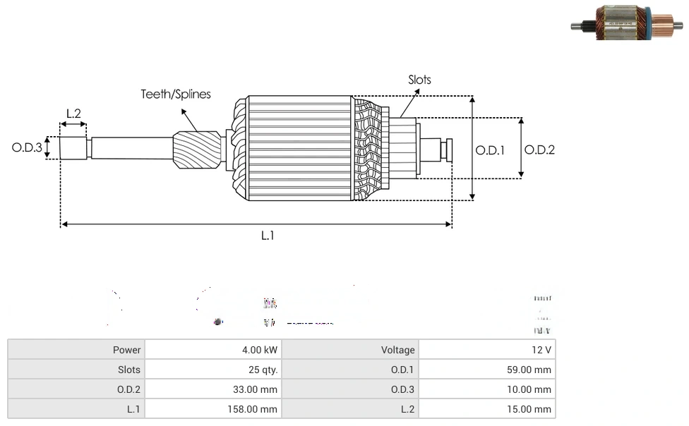 Starter armatures Power [ kW ] 4.00 Voltage [ V ] 12 Slots [ qty. ] 25 O.D.1 [ mm ] 59.00 O.D.2 [ mm ] 33.00 O.D.3 [ mm ] 10.00 L.1 [ mm ] 158.00 L.2 [ mm ] 15.00