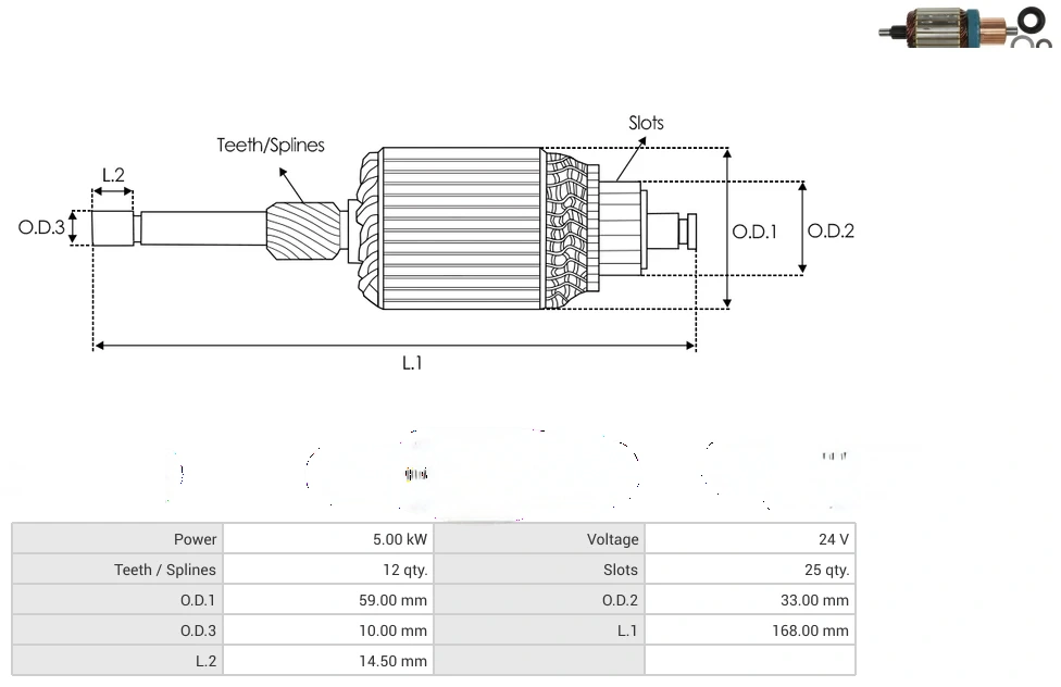 Starter armatures Power [ kW ] 5.00 Voltage [ V ] 24 Teeth / Splines [ qty. ] 12 Slots [ qty. ] 25 O.D.1 [ mm ] 59.00 O.D.2 [ mm ] 33.00 O.D.3 [ mm ] 10.00 L.1 [ mm ] 168.00 L.2 [ mm ] 14.50