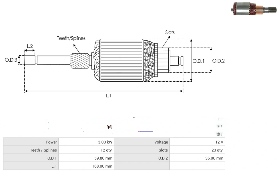 Starter armatures Power [ kW ] 3.00 Voltage [ V ] 12 Teeth / Splines [ qty. ] 12 Slots [ qty. ] 23 O.D.1 [ mm ] 59.80 O.D.2 [ mm ] 36.00 L.1 [ mm ] 168.00