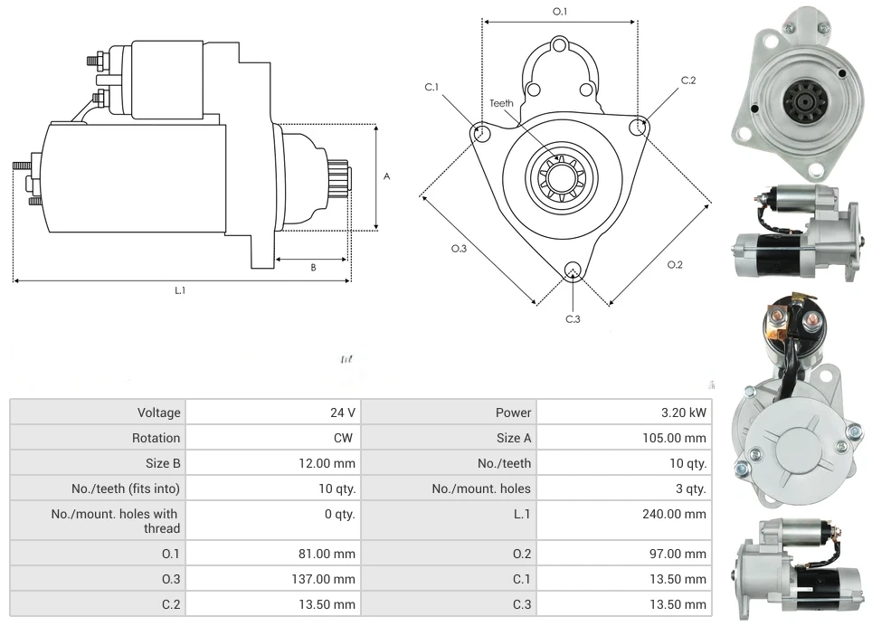 Starters Voltage [ V ] 24 Power [ kW ] 3.20 Rotation CW Size A [ mm ] 105.00 Size B [ mm ] 12.00 No./teeth [ qty. ] 10 No./teeth (fits into) [ qty. ] 10 No./mount. holes [ qty. ] 3 No./mount. holes with thread [ qty. ] 0 L.1 [ mm ] 240.00 O.1 [ mm ] 81.00 O.2 [ mm ] 97.00 O.3 [ mm ] 137.00 C.1 [ mm ] 13.50 C.2 [ mm ] 13.50 C.3 [ mm ] 13.50