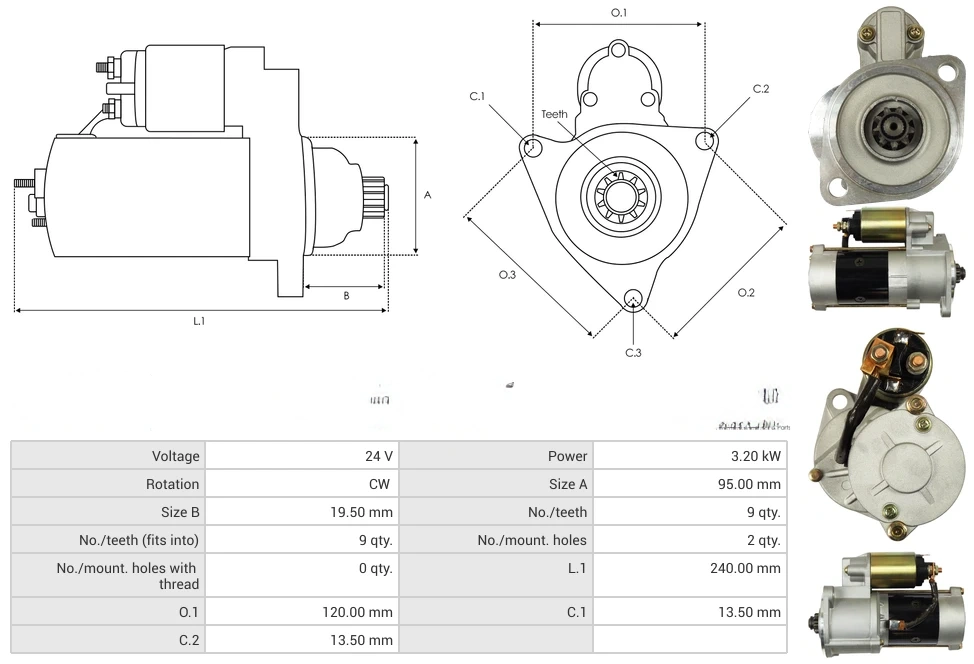 Starters Voltage [ V ] 24 Power [ kW ] 3.20 Rotation CW Size A [ mm ] 95.00 Size B [ mm ] 19.50 No./teeth [ qty. ] 9 No./teeth (fits into) [ qty. ] 9 No./mount. holes [ qty. ] 2 No./mount. holes with thread [ qty. ] 0 L.1 [ mm ] 240.00 O.1 [ mm ] 120.00 C.1 [ mm ] 13.50 C.2 [ mm ] 13.50