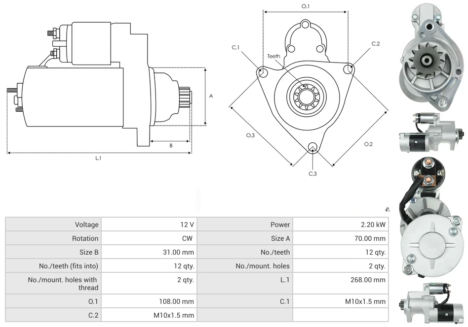 Starters Voltage [ V ] 12 Power [ kW ] 2.20 Rotation CW Size A [ mm ] 70.00 Size B [ mm ] 31.00 No./teeth [ qty. ] 12 No./teeth (fits into) [ qty. ] 12 No./mount. holes [ qty. ] 2 No./mount. holes with thread [ qty. ] 2 L.1 [ mm ] 268.00 O.1 [ mm ] 108.00 C.1 [ mm ] M10x1.5 C.2 [ mm ] M10x1.5