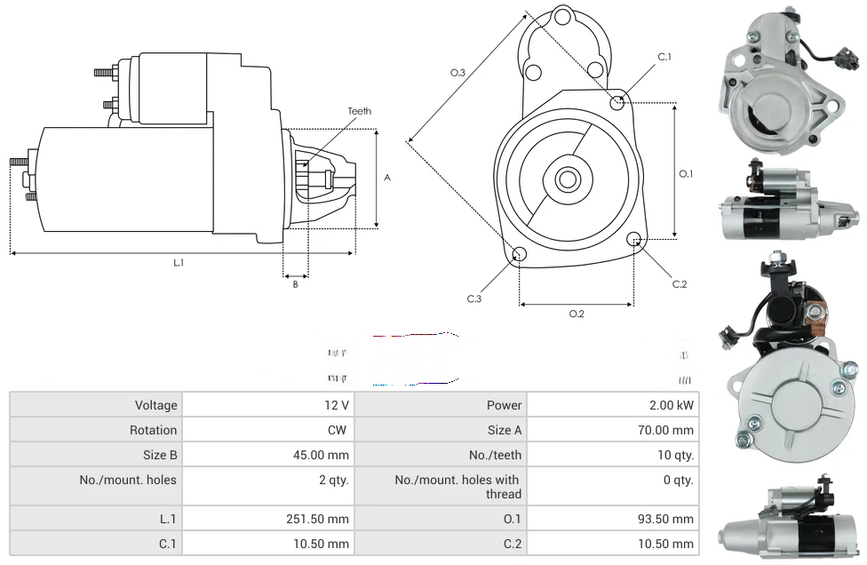 Starters Voltage [ V ] 12 Power [ kW ] 2.00 Rotation CW Size A [ mm ] 70.00 Size B [ mm ] 45.00 No./teeth [ qty. ] 10 No./mount. holes [ qty. ] 2 No./mount. holes with thread [ qty. ] 0 L.1 [ mm ] 251.50 O.1 [ mm ] 93.50 C.1 [ mm ] 10.50 C.2 [ mm ] 10.50