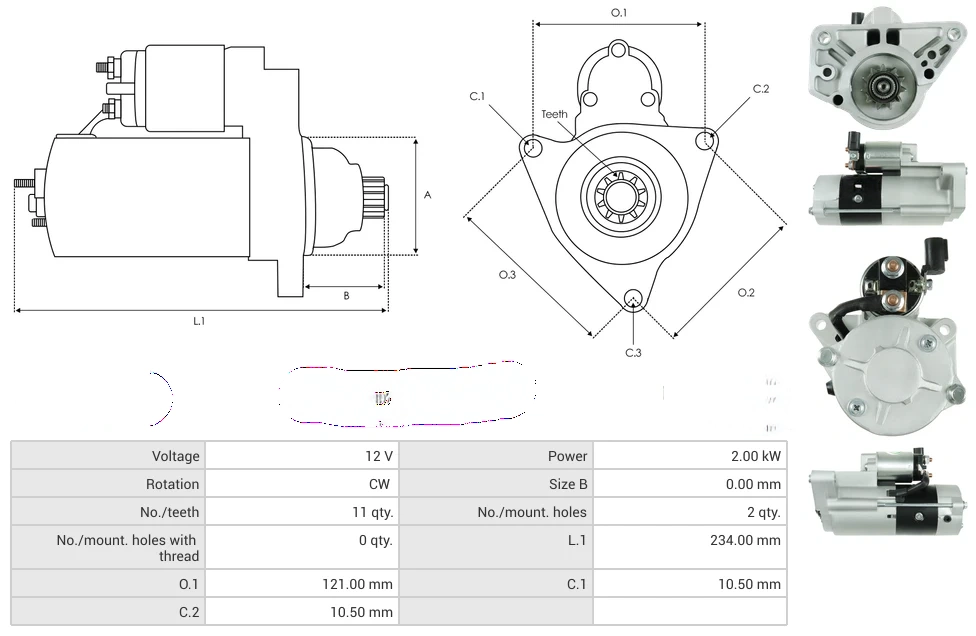 Starters Voltage [ V ] 12 Power [ kW ] 2.00 Rotation CW Size B [ mm ] 0.00 No./teeth [ qty. ] 11 No./mount. holes [ qty. ] 2 No./mount. holes with thread [ qty. ] 0 L.1 [ mm ] 234.00 O.1 [ mm ] 121.00 C.1 [ mm ] 10.50 C.2 [ mm ] 10.50