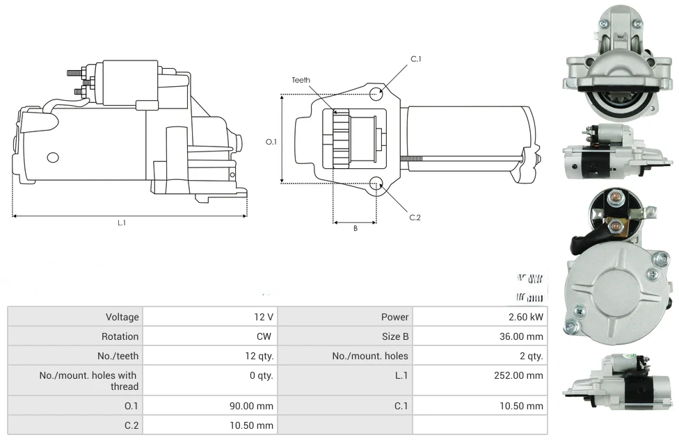 Starters Voltage [ V ] 12 Power [ kW ] 2.60 Rotation CW Size B [ mm ] 36.00 No./teeth [ qty. ] 12 No./mount. holes [ qty. ] 2 No./mount. holes with thread [ qty. ] 0 L.1 [ mm ] 252.00 O.1 [ mm ] 90.00 C.1 [ mm ] 10.50 C.2 [ mm ] 10.50