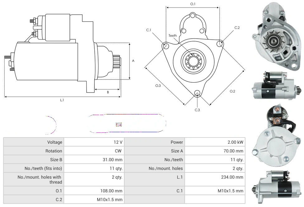 Starters Voltage [ V ] 12 Power [ kW ] 2.00 Rotation CW Size A [ mm ] 70.00 Size B [ mm ] 31.00 No./teeth [ qty. ] 11 No./teeth (fits into) [ qty. ] 11 No./mount. holes [ qty. ] 2 No./mount. holes with thread [ qty. ] 2 L.1 [ mm ] 234.00 O.1 [ mm ] 108.00 C.1 [ mm ] M10x1.5 C.2 [ mm ] M10x1.5