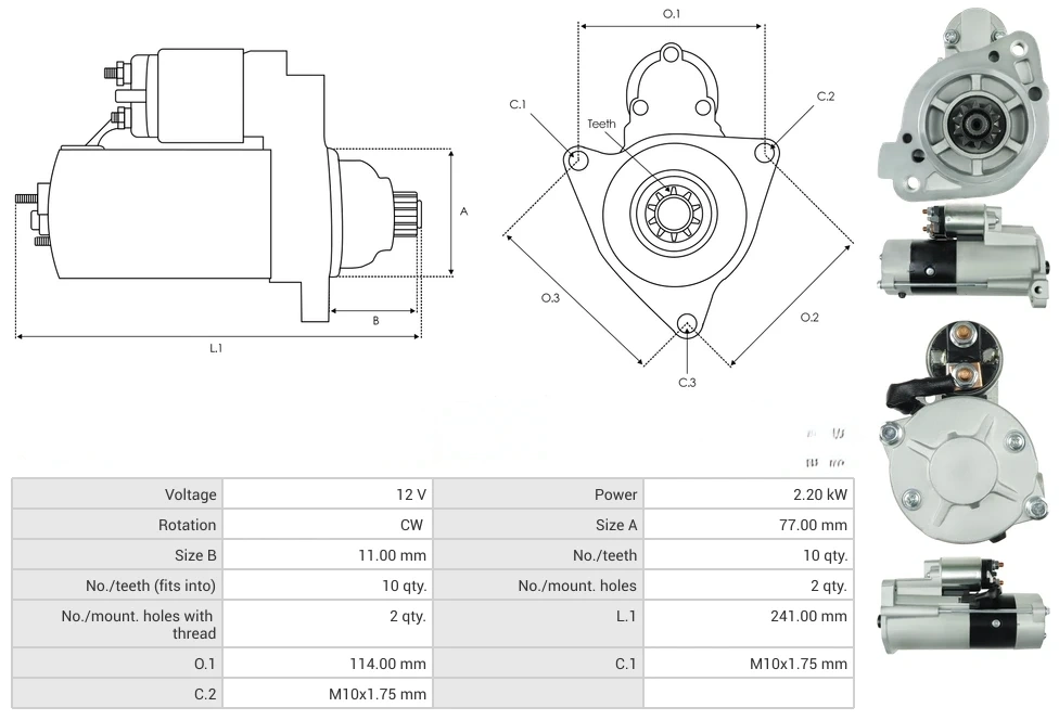 Starters Voltage [ V ] 12 Power [ kW ] 2.20 Rotation CW Size A [ mm ] 77.00 Size B [ mm ] 11.00 No./teeth [ qty. ] 10 No./teeth (fits into) [ qty. ] 10 No./mount. holes [ qty. ] 2 No./mount. holes with thread [ qty. ] 2 L.1 [ mm ] 241.00 O.1 [ mm ] 114.00 C.1 [ mm ] M10x1.75 C.2 [ mm ] M10x1.75