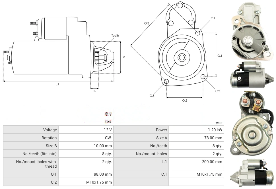 Starters Voltage [ V ] 12 Power [ kW ] 1.20 Rotation CW Size A [ mm ] 73.00 Size B [ mm ] 10.00 No./teeth [ qty. ] 8 No./teeth (fits into) [ qty. ] 8 No./mount. holes [ qty. ] 2 No./mount. holes with thread [ qty. ] 2 L.1 [ mm ] 209.00 O.1 [ mm ] 98.00 C.1 [ mm ] M10x1.75 C.2 [ mm ] M10x1.75
