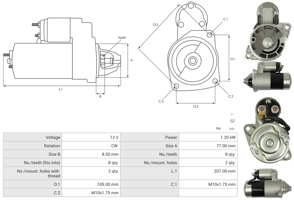 Starters Voltage [ V ] 12 Power [ kW ] 1.20 Rotation CW Size A [ mm ] 77.00 Size B [ mm ] 8.50 No./teeth [ qty. ] 8 No./teeth (fits into) [ qty. ] 8 No./mount. holes [ qty. ] 2 No./mount. holes with thread [ qty. ] 2 L.1 [ mm ] 207.00 O.1 [ mm ] 105.00 C.1 [ mm ] M10x1.75 C.2 [ mm ] M10x1.75