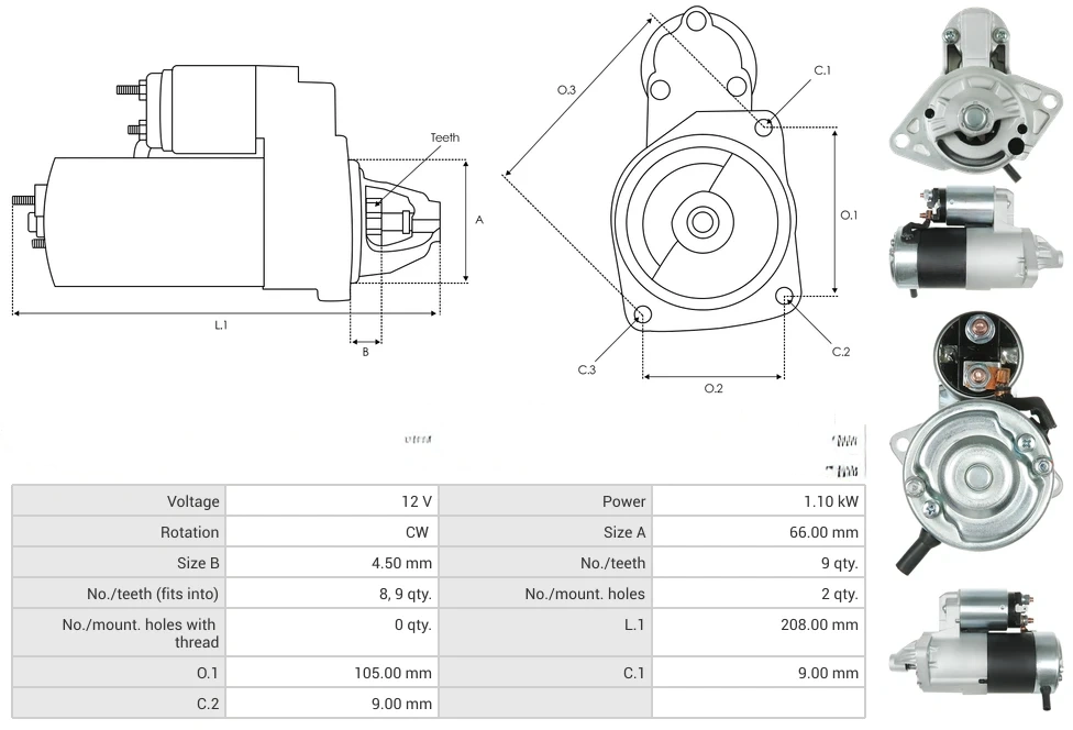 Starters Voltage [ V ] 12 Power [ kW ] 1.4 Rotation CW Size A [ mm ] 66.00 Size B [ mm ] 4.50 No./teeth [ qty. ] 9 No./teeth (fits into) [ qty. ] 8, 9 No./mount. holes [ qty. ] 2 No./mount. holes with thread [ qty. ] 0 L.1 [ mm ] 208.00 O.1 [ mm ] 105.00 C.1 [ mm ] 9.00 C.2 [ mm ] 9.00