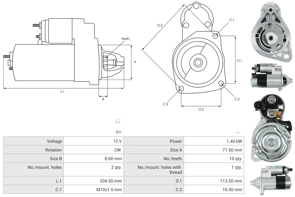 Starters Voltage [ V ] 12 Power [ kW ] 1.40 Rotation CW Size A [ mm ] 71.50 Size B [ mm ] 8.00 No./teeth [ qty. ] 10 No./mount. holes [ qty. ] 2 No./mount. holes with thread [ qty. ] 1 L.1 [ mm ] 204.50 O.1 [ mm ] 113.50 C.1 [ mm ] M10x1.5 C.2 [ mm ] 10.50