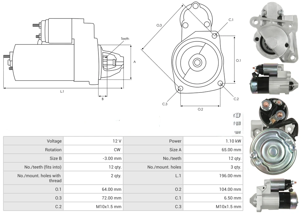 Starters Voltage [ V ] 12 Power [ kW ] 1.20 Rotation CW Size A [ mm ] 65.00 Size B [ mm ] -3.00 No./teeth [ qty. ] 12 No./teeth (fits into) [ qty. ] 12 No./mount. holes [ qty. ] 3 No./mount. holes with thread [ qty. ] 2 L.1 [ mm ] 196.00 O.1 [ mm ] 64.00 O.2 [ mm ] 104.00 O.3 [ mm ] 72.00 C.1 [ mm ] 6.50 C.2 [ mm ] M10x1.5 C.3 [ mm ] M10x1.5