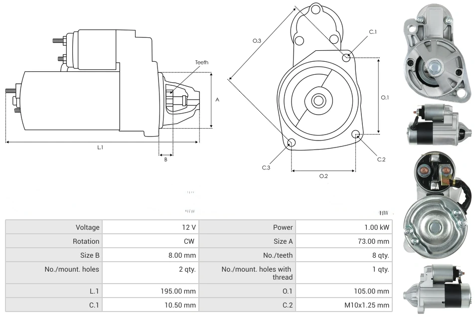 Starters Voltage [ V ] 12 Power [ kW ] 1.00 Rotation CW Size A [ mm ] 73.00 Size B [ mm ] 8.00 No./teeth [ qty. ] 8 No./mount. holes [ qty. ] 2 No./mount. holes with thread [ qty. ] 1 L.1 [ mm ] 195.00 O.1 [ mm ] 105.00 C.1 [ mm ] 10.50 C.2 [ mm ] M10x1.25