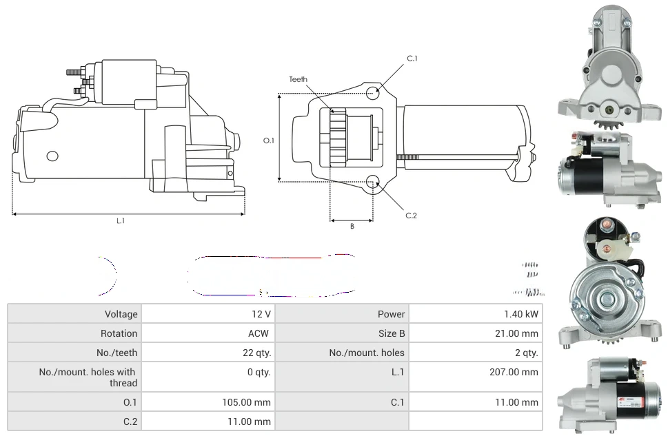 Starters Voltage [ V ] 12 Power [ kW ] 1.40 Rotation CCW Size B [ mm ] 21.00 No./teeth [ qty. ] 22 No./mount. holes [ qty. ] 2 No./mount. holes with thread [ qty. ] 0 L.1 [ mm ] 207.00 O.1 [ mm ] 105.00 C.1 [ mm ] 11.00 C.2 [ mm ] 11.00