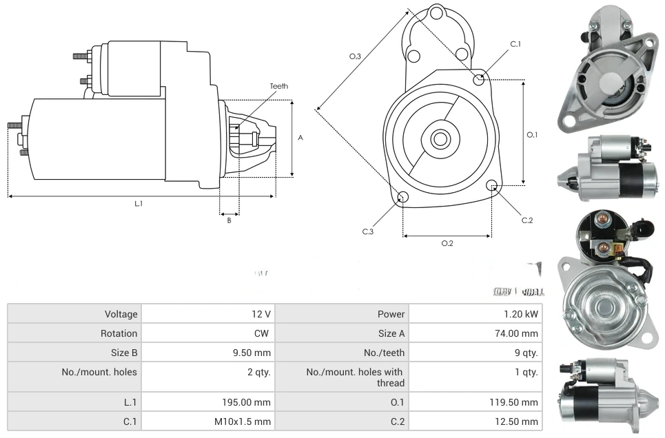 Starters Voltage [ V ] 12 Power [ kW ] 1.20 Rotation CW Size A [ mm ] 74.00 Size B [ mm ] 9.50 No./teeth [ qty. ] 9 No./mount. holes [ qty. ] 2 No./mount. holes with thread [ qty. ] 1 L.1 [ mm ] 195.00 O.1 [ mm ] 119.50 C.1 [ mm ] M10x1.5 C.2 [ mm ] 12.50