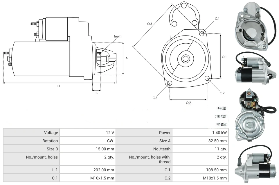 Starters Voltage [ V ] 12 Power [ kW ] 1.40 Rotation CW Size A [ mm ] 82.50 Size B [ mm ] 15.00 No./teeth [ qty. ] 11 No./mount. holes [ qty. ] 2 No./mount. holes with thread [ qty. ] 2 L.1 [ mm ] 202.00 O.1 [ mm ] 108.50 C.1 [ mm ] M10x1.5 C.2 [ mm ] M10x1.5