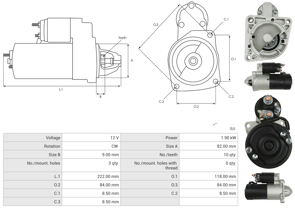 Starters Voltage [ V ] 12 Power [ kW ] 1.80 Rotation CW Size A [ mm ] 81.80 Size B [ mm ] 9.00 No./teeth [ qty. ] 10 No./mount. holes [ qty. ] 3 No./mount. holes with thread [ qty. ] 0 L.1 [ mm ] 221.50 O.1 [ mm ] 116.00 O.2 [ mm ] 82.00 O.3 [ mm ] 82.00 C.1 [ mm ] 9.00 C.2 [ mm ] 9.00 C.3 [ mm ] 9.00
