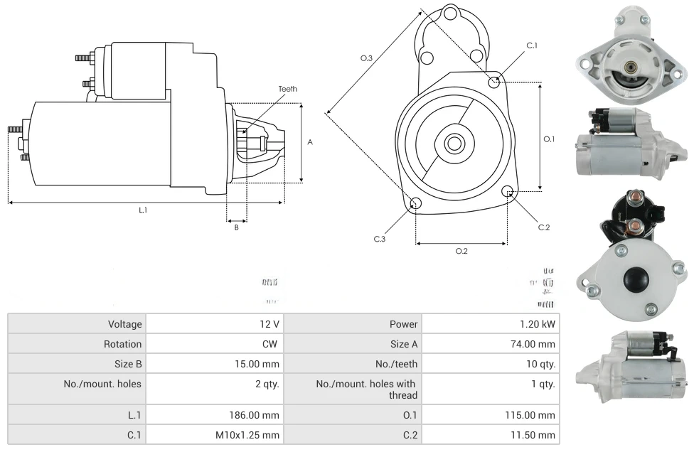 Starters Voltage [ V ] 12 Power [ kW ] 1.30 Rotation CW Size A [ mm ] 74.00 Size B [ mm ] 15.00 No./teeth [ qty. ] 10 No./mount. holes [ qty. ] 2 No./mount. holes with thread [ qty. ] 1 L.1 [ mm ] 186.00 O.1 [ mm ] 115.00 C.1 [ mm ] M10x1.25 C.2 [ mm ] 11.50