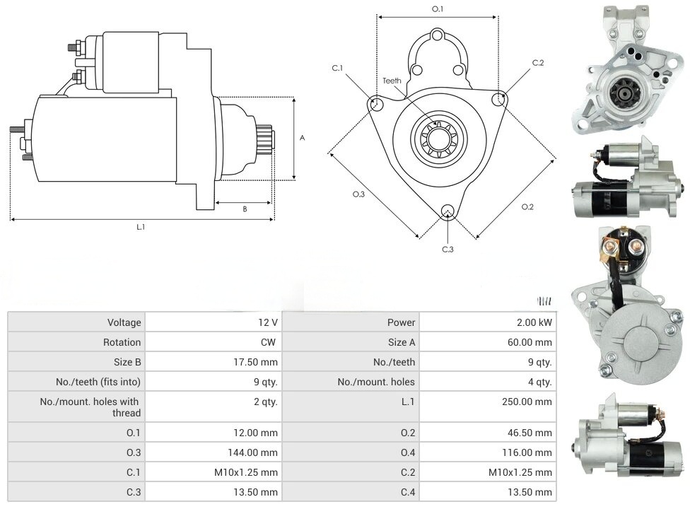 Product features:Voltage [ V ] 12 Power [ kW ] 2.00 Rotation CW Size A [ mm ] 60.00 Size B [ mm ] 17.50 No./teeth [ qty. ] 9 No./teeth (fits into) [ qty. ] 9 No./mount. holes [ qty. ] 4 No./mount. holes with thread [ qty. ] 2
