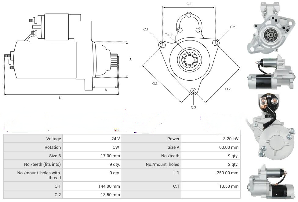 Product features: Voltage [ V ] 24 Power [ kW ] 3.20 Rotation CW Size A [ mm ] 60.00 Size B [ mm ] 17.00 No./teeth [ qty. ] 9 No./teeth (fits into) [ qty. ] 9 No./mount. holes [ qty. ] 2