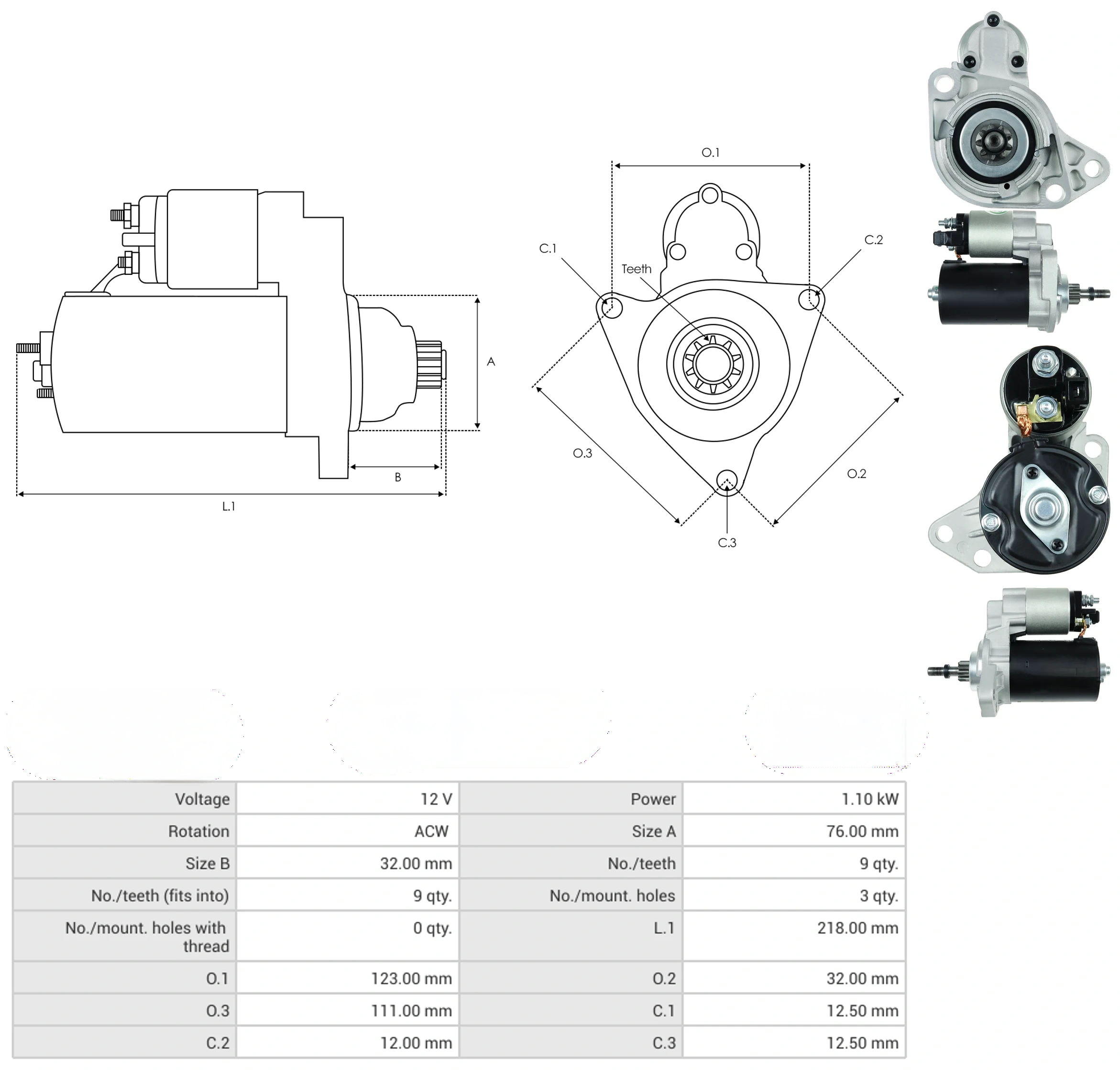 Starters Voltage [ V ] 12 Power [ kW ] 1.10 Rotation ACW Size A [ mm ] 76.00 Size B [ mm ] 32.00 No./teeth [ qty. ] 9 No./teeth (fits into) [ qty. ] 9 No./mount. holes [ qty. ] 3 No./mount. holes with thread [ qty. ] 0 L.1 [ mm ] 218.00 O.1 [ mm ] 123.00 O.2 [ mm ] 32.00 O.3 [ mm ] 111.00 C.1 [ mm ] 12.50 C.2 [ mm ] 12.00 C.3 [ mm ] 12.50
