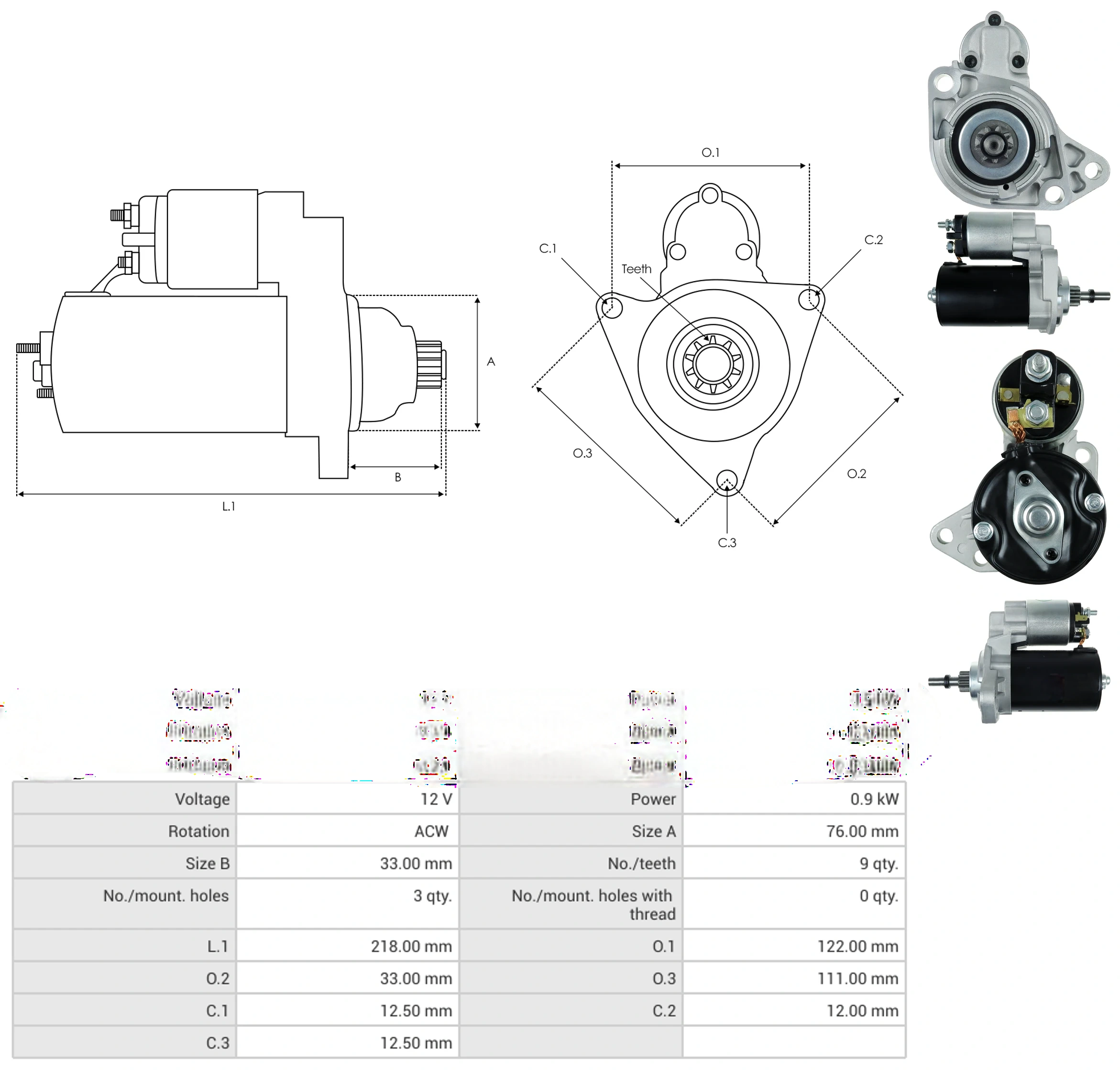 Starters Voltage [ V ] 12 Power [ kW ] 0.9 Rotation ACW Size A [ mm ] 76.00 Size B [ mm ] 33.00 No./teeth [ qty. ] 9 No./mount. holes [ qty. ] 3 No./mount. holes with thread [ qty. ] 0 L.1 [ mm ] 218.00 O.1 [ mm ] 122.00 O.2 [ mm ] 33.00 O.3 [ mm ] 111.00 C.1 [ mm ] 12.50 C.2 [ mm ] 12.00 C.3 [ mm ] 12.50