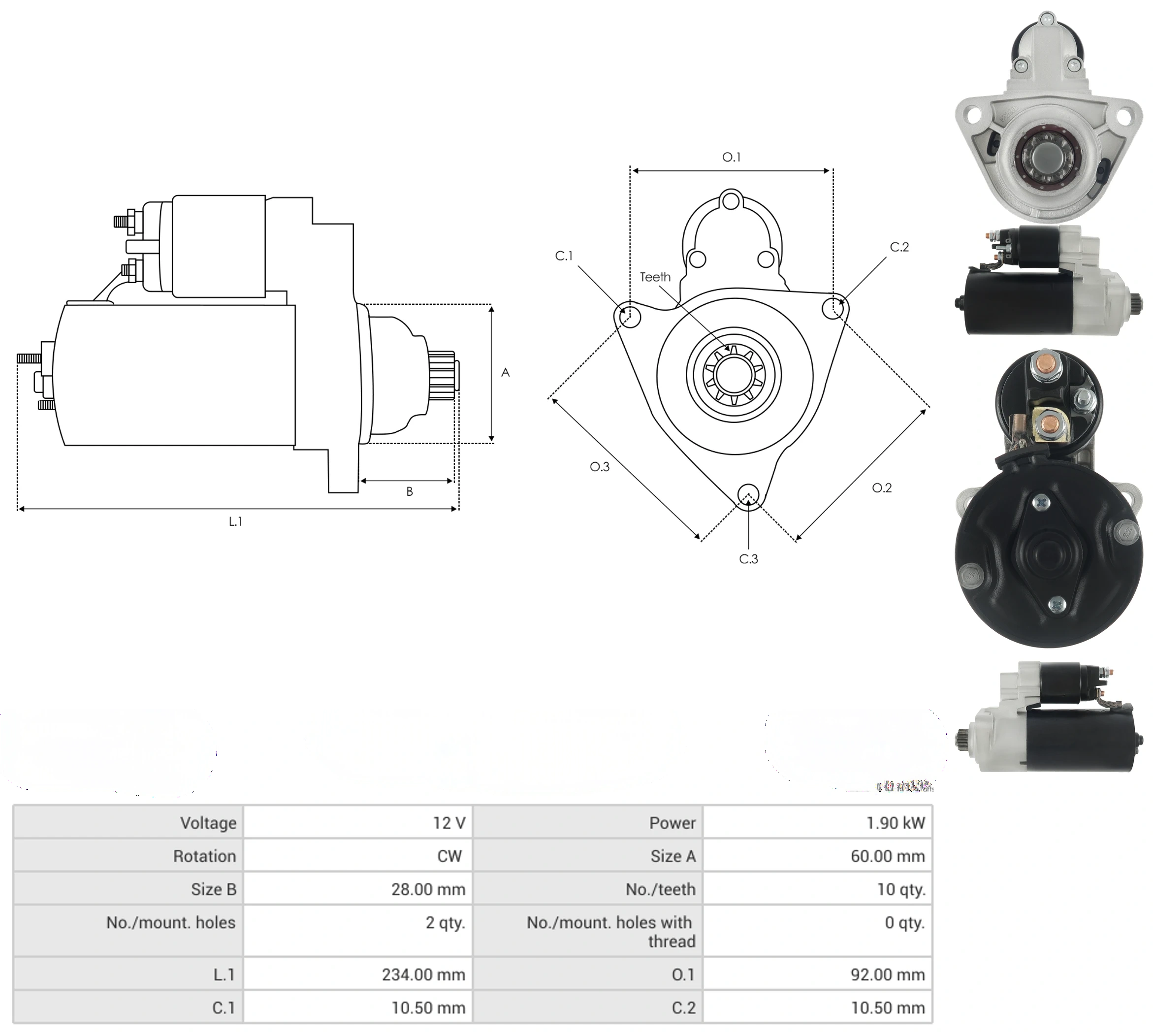 Starters Voltage [ V ] 12 Power [ kW ] 1.90 Rotation CW Size A [ mm ] 60.00 Size B [ mm ] 28.00 No./teeth [ qty. ] 10 No./mount. holes [ qty. ] 2 No./mount. holes with thread [ qty. ] 0 L.1 [ mm ] 234.00 O.1 [ mm ] 92.00 C.1 [ mm ] 10.50 C.2 [ mm ] 10.50