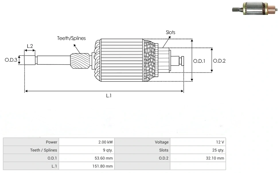 Product features:Power [ kW ] 2.00 Voltage [ V ] 12 Teeth / Splines [ qty. ] 9 Slots [ qty. ] 25 O.D.1 [ mm ] 53.60 O.D.2 [ mm ] 32.10 L.1 [ mm ] 151.80