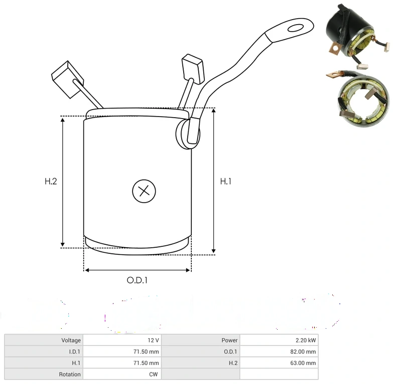 Starter yokes with field coils Voltage [ V ] 12 Power [ kW ] 2.20 I.D.1 [ mm ] 71.50 O.D.1 [ mm ] 82.00 H.1 [ mm ] 71.50 H.2 [ mm ] 63.00 Rotation CW