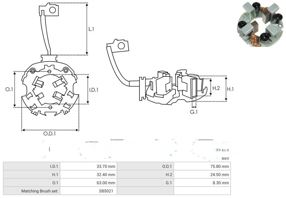 Starter brush holders I.D.1 [ mm ] 33.70 O.D.1 [ mm ] 75.80 H.1 [ mm ] 32.40 H.2 [ mm ] 24.50 O.1 [ mm ] 63.00 G.1 [ mm ] 8.30