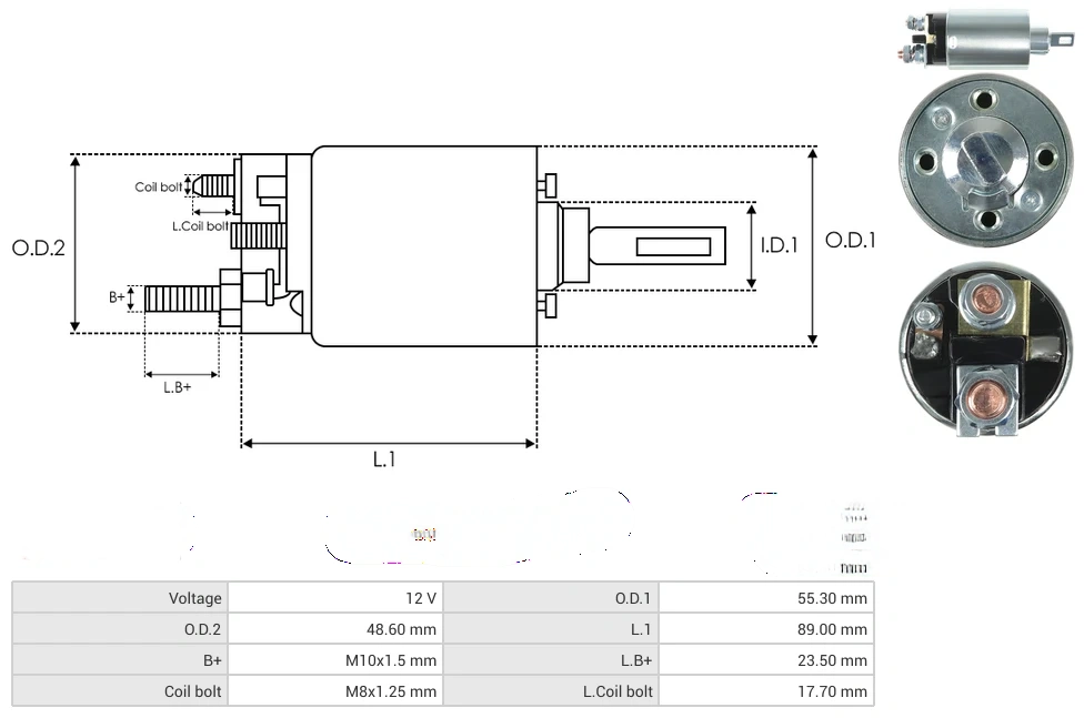 Starter solenoids Voltage [ V ] 12 O.D.1 [ mm ] 55.30 O.D.2 [ mm ] 48.60 L.1 [ mm ] 89.00 B+ [ mm ] M10x1.5 L.B+ [ mm ] 23.50 Coil bolt [ mm ] M8x1.25 L.Coil bolt [ mm ] 17.70