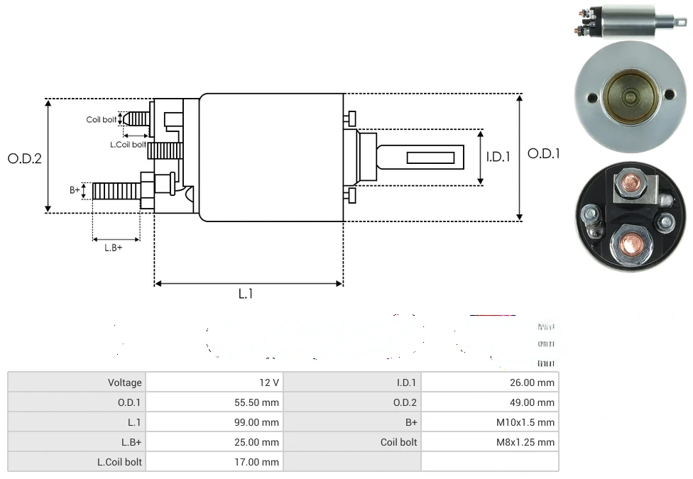 Starter solenoids Voltage [ V ] 12 I.D.1 [ mm ] 26.00 O.D.1 [ mm ] 55.50 O.D.2 [ mm ] 49.00 L.1 [ mm ] 99.00 B+ [ mm ] M10x1.5 L.B+ [ mm ] 25.00 Coil bolt [ mm ] M8x1.25 L.Coil bolt [ mm ] 17.00