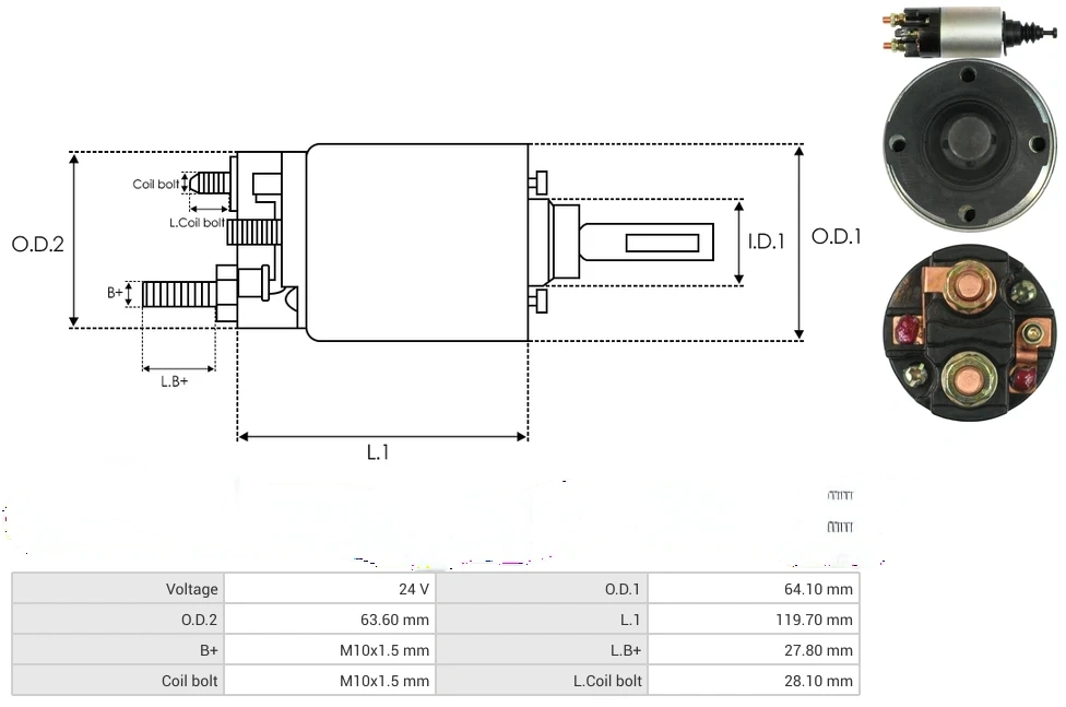 Starter solenoids Voltage [ V ] 24 O.D.1 [ mm ] 64.10 O.D.2 [ mm ] 63.60 L.1 [ mm ] 119.70 B+ [ mm ] M10x1.5 L.B+ [ mm ] 27.80 Coil bolt [ mm ] M10x1.5 L.Coil bolt [ mm ] 28.10