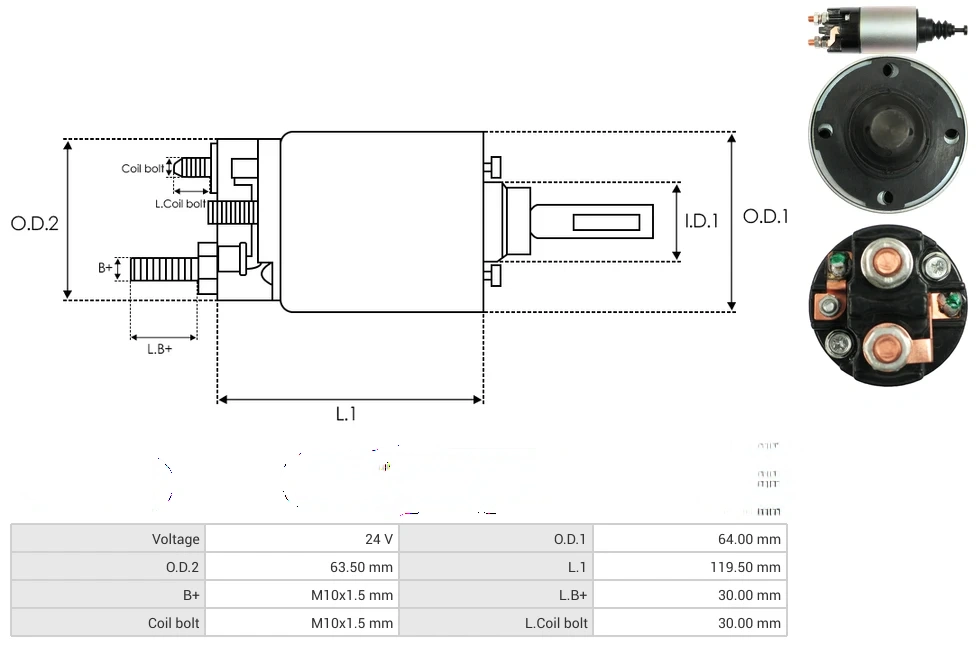 Starter solenoids Voltage [ V ] 24 O.D.1 [ mm ] 64.00 O.D.2 [ mm ] 63.50 L.1 [ mm ] 119.50 B+ [ mm ] M10x1.5 L.B+ [ mm ] 30.00 Coil bolt [ mm ] M10x1.5 L.Coil bolt [ mm ] 30.00