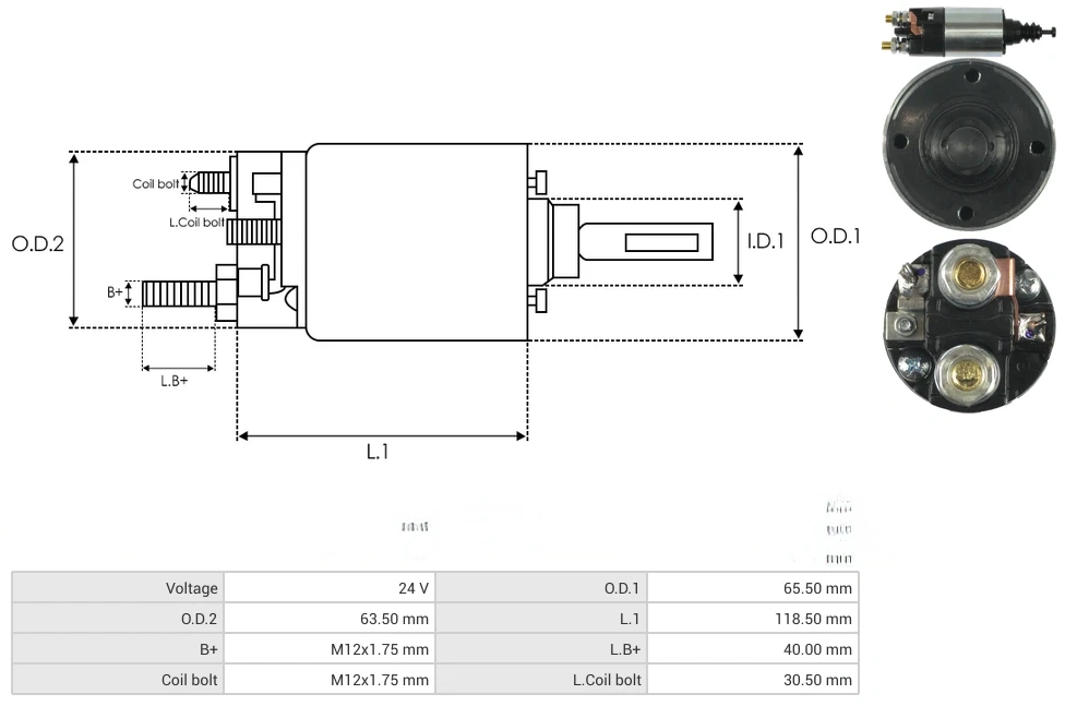 Starter solenoids Voltage [ V ] 24 O.D.1 [ mm ] 65.50 O.D.2 [ mm ] 63.50 L.1 [ mm ] 118.50 B+ [ mm ] M12x1.75 L.B+ [ mm ] 40.00 Coil bolt [ mm ] M12x1.75 L.Coil bolt [ mm ] 30.50