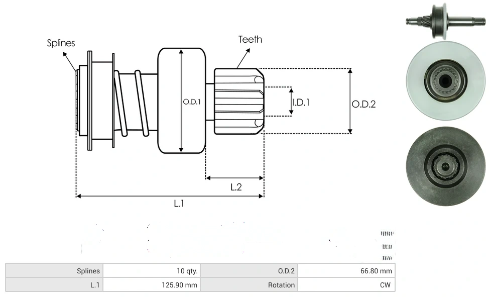 Starter drives Splines [ qty. ] 10 O.D.2 [ mm ] 66.80 L.1 [ mm ] 125.90 Rotation CW