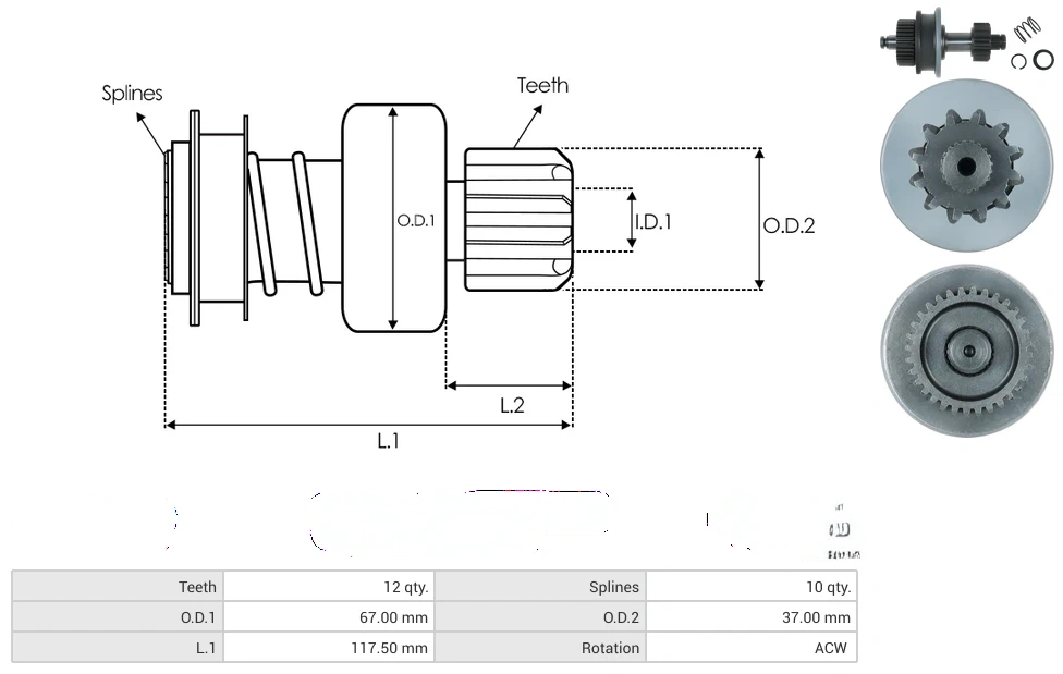 Starter drives Teeth [ qty. ] 12 Splines [ qty. ] 10 O.D.1 [ mm ] 67.00 O.D.2 [ mm ] 37.00 L.1 [ mm ] 117.50 Rotation ACW