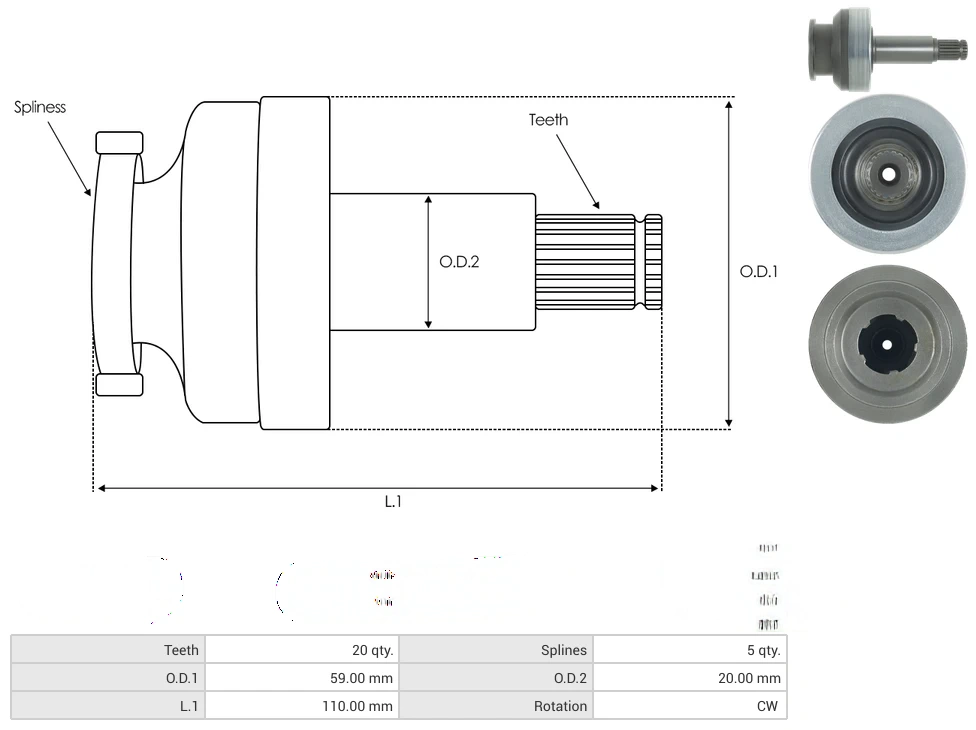 Starter clutches Teeth [ qty. ] 20 Splines [ qty. ] 5 O.D.1 [ mm ] 59.00 O.D.2 [ mm ] 20.00 L.1 [ mm ] 110.00 Rotation CW