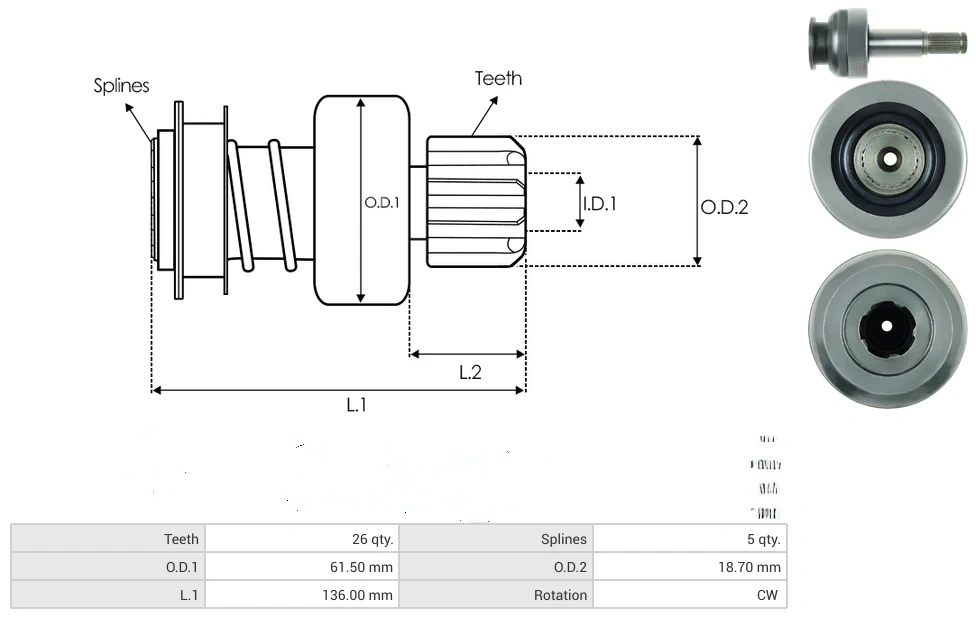 Starter drives Teeth [ qty. ] 26 Splines [ qty. ] 5 O.D.1 [ mm ] 61.50 O.D.2 [ mm ] 18.70 L.1 [ mm ] 136.00 Rotation CW