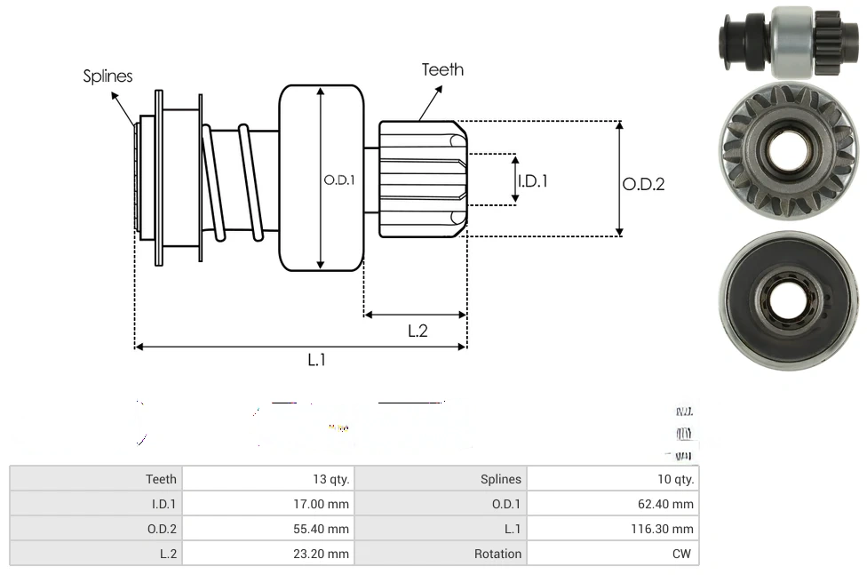 Starter drives Teeth [ qty. ] 13 Splines [ qty. ] 10 I.D.1 [ mm ] 17.00 O.D.1 [ mm ] 62.40 O.D.2 [ mm ] 55.40 L.1 [ mm ] 116.30 L.2 [ mm ] 23.20 Rotation CW