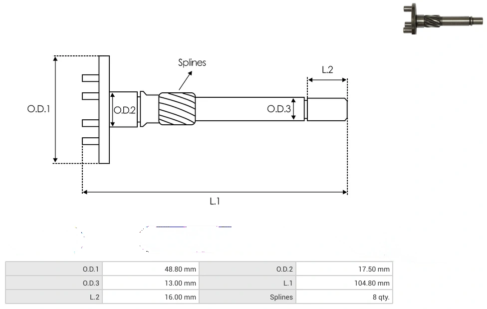 Starter gear shafts O.D.1 [ mm ] 48.80 O.D.2 [ mm ] 17.50 O.D.3 [ mm ] 13.00 L.1 [ mm ] 104.80 L.2 [ mm ] 16.00 Splines [ qty. ] 8