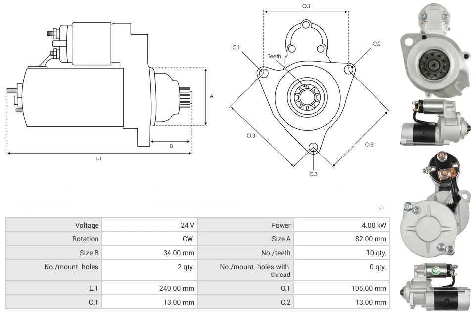 Starters Voltage [ V ] 24 Power [ kW ] 4.00 Rotation CW Size A [ mm ] 82.00 Size B [ mm ] 34.00 No./teeth [ qty. ] 10 No./mount. holes [ qty. ] 2 No./mount. holes with thread [ qty. ] 0 L.1 [ mm ] 240.00 O.1 [ mm ] 105.00 C.1 [ mm ] 13.00 C.2 [ mm ] 13.00