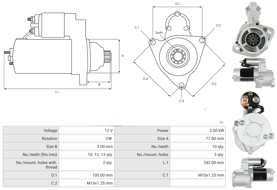 Starters Voltage [ V ] 12 Power [ kW ] 2.00 Rotation CW Size A [ mm ] 77.00 Size B [ mm ] 3.00 No./teeth [ qty. ] 10 No./teeth (fits into) [ qty. ] 10. 12. 13 No./mount. holes [ qty. ] 2 No./mount. holes with thread [ qty. ] 2 L.1 [ mm ] 242.00 O.1 [ mm ] 105.00 C.1 [ mm ] M10x1.25 C.2 [ mm ] M10x1.25
