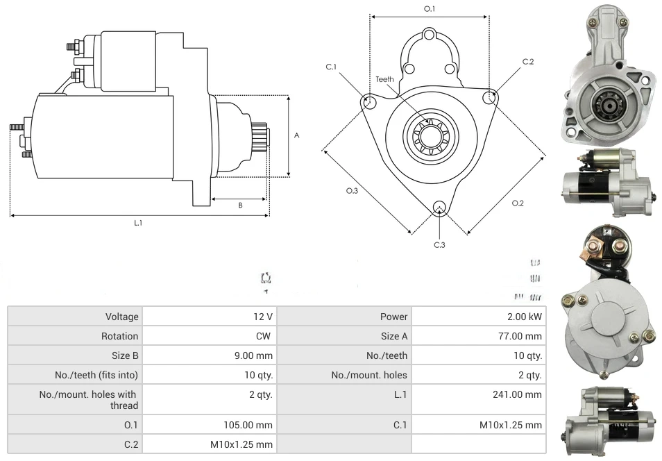 Starters Voltage [ V ] 12 Power [ kW ] 2.00 Rotation CW Size A [ mm ] 77.00 Size B [ mm ] 9.00 No./teeth [ qty. ] 10 No./teeth (fits into) [ qty. ] 10 No./mount. holes [ qty. ] 2 No./mount. holes with thread [ qty. ] 2 L.1 [ mm ] 241.00 O.1 [ mm ] 105.00 C.1 [ mm ] M10x1.25 C.2 [ mm ] M10x1.25