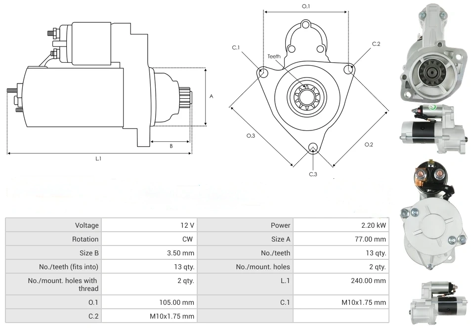 Starters Voltage [ V ] 12 Power [ kW ] 2.20 Rotation CW Size A [ mm ] 77.00 Size B [ mm ] 3.50 No./teeth [ qty. ] 13 No./teeth (fits into) [ qty. ] 13 No./mount. holes [ qty. ] 2 No./mount. holes with thread [ qty. ] 2 L.1 [ mm ] 240.00 O.1 [ mm ] 105.00 C.1 [ mm ] M10x1.75 C.2 [ mm ] M10x1.75
